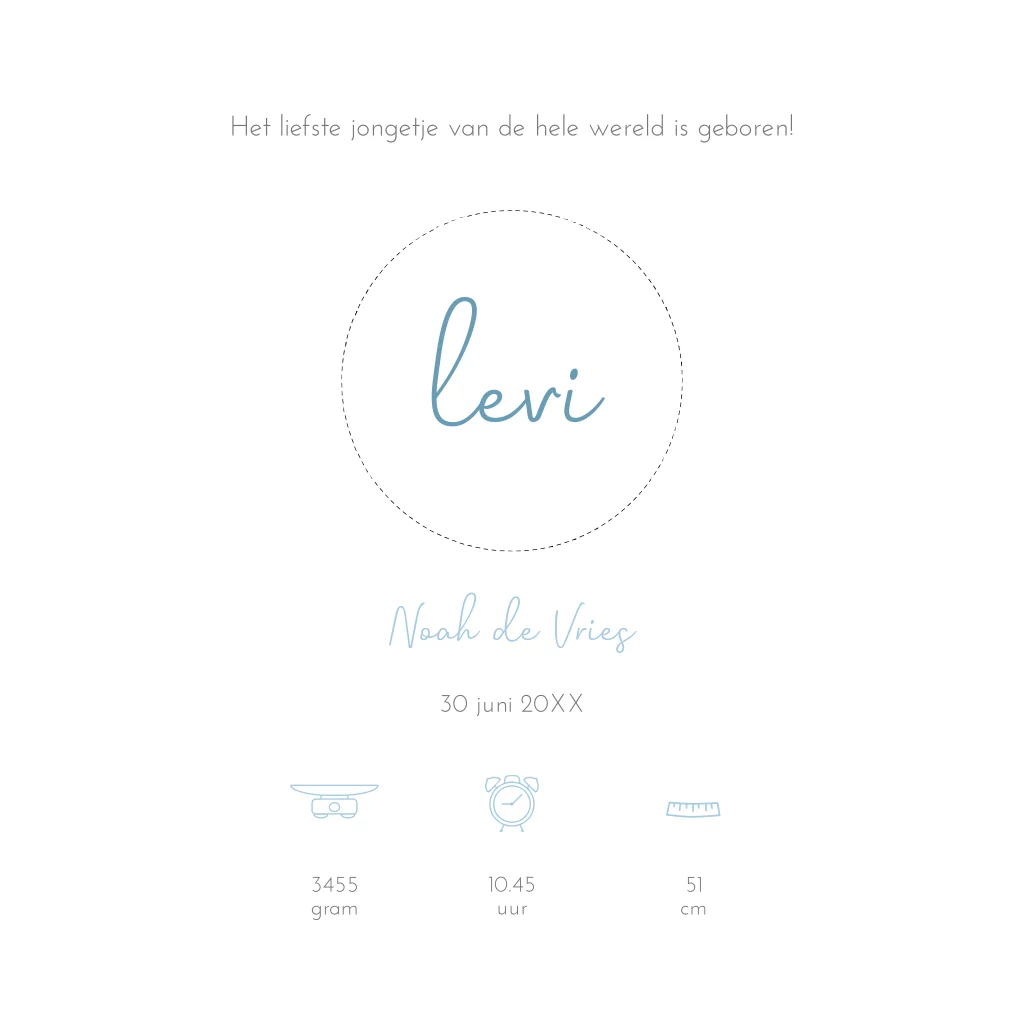 Dit unieke geboortekaartje heeft een baby blauwe watercolour achtergrond. Op de voorkant staat het silhouet van een jongen met een ballon in zijn hand. De ballon geeft een doorkijkje naar de binnenkant van de kaart waar de naam van jullie kleintje staat. Pas het kaartje naar wens aan in onze online editor en bestel snel een proefdruk om dit kaartje in het echt te zien!