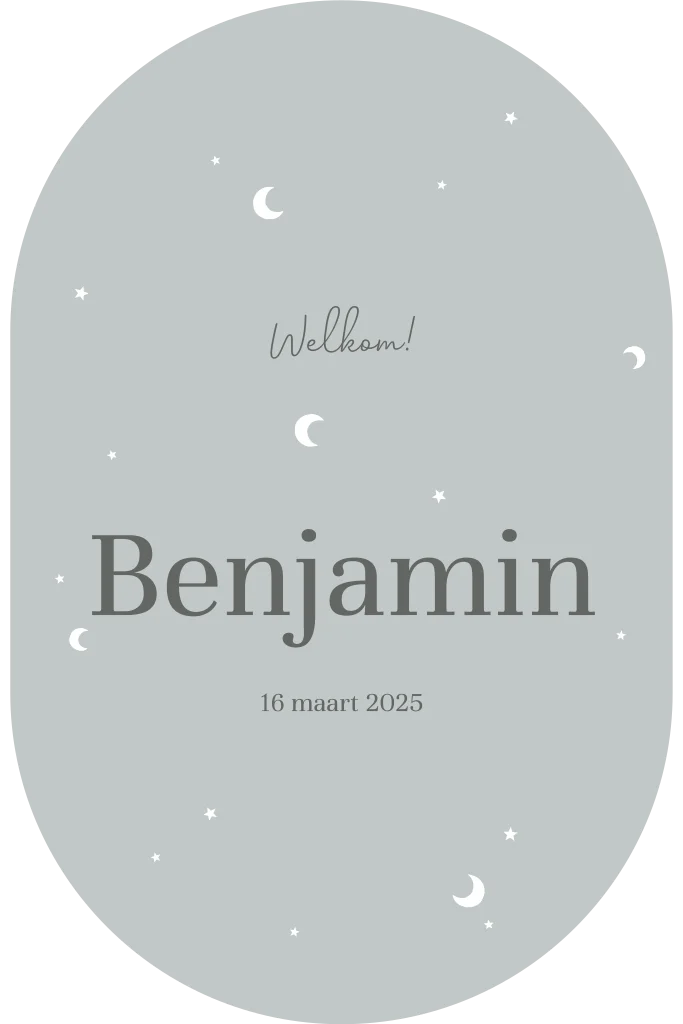 Dit is een uniek kaartje voor jullie pasgeboren zoontje. De witte sterretjes en maantjes komen goed naar voren tegen de lichtgrijze achtergrond. Het kaartje heeft de vorm van een ovaal. Op de achterkant staat een mooie bijbeltekst. Pas het kaartje naar eigen wens aan in onze online editor en bestel snel een proefdruk om dit kaartje in het echt te zien!