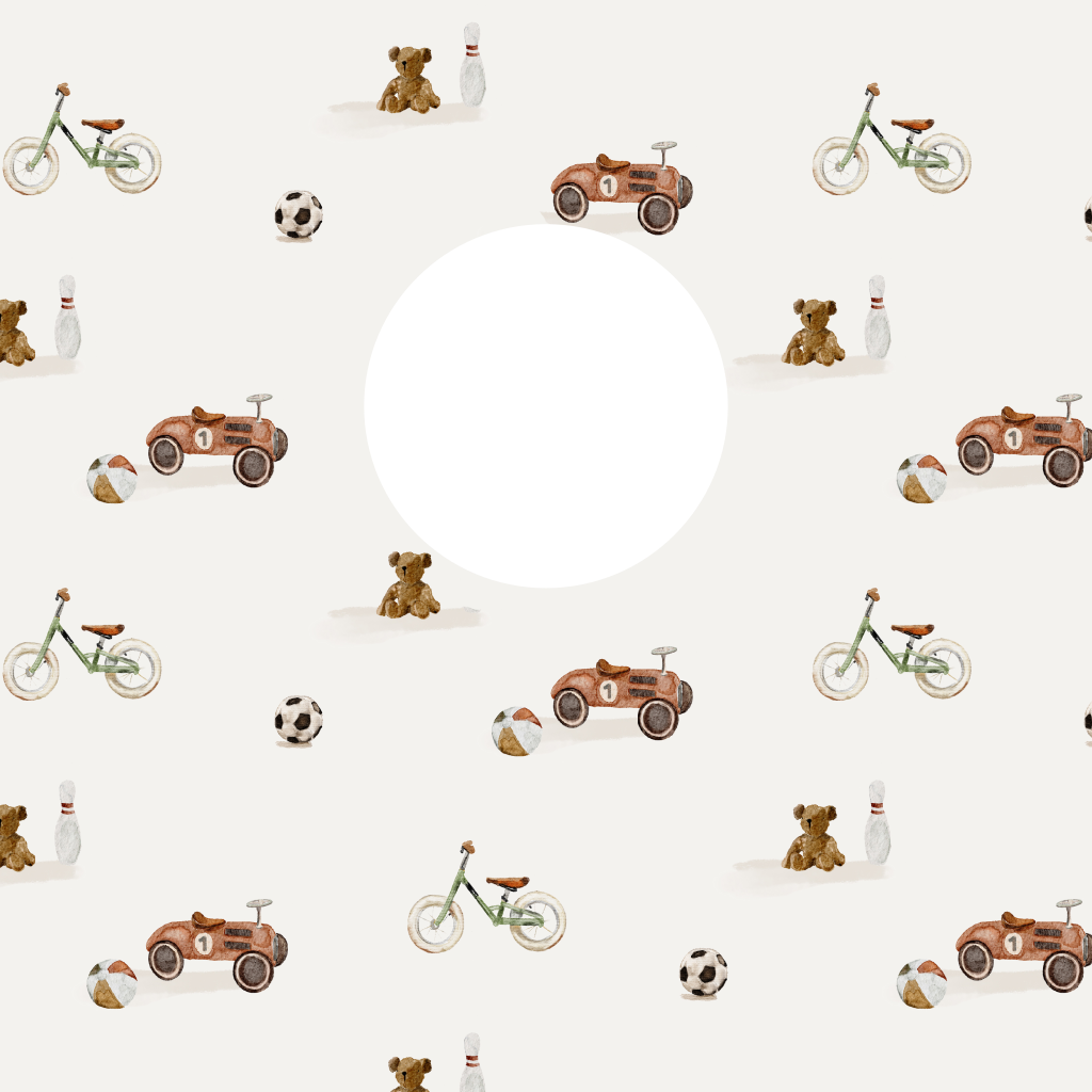 Een tof geboortekaartje voor jouw kindje. Het kaartje heeft een patroon van verschillend speelgoed. Daarnaast heeft het kaartje een doorkijkje naar de binnenkant van het kaartje. Door dit doorkijkje zie je de naam van jullie kindje. Pas het geboortekaartje aan in onze online editor en bestel een proefdruk om het kaartje in het echt te zien.