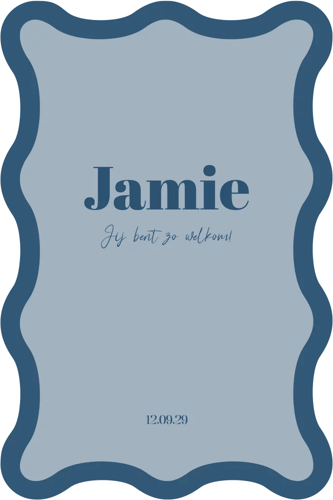 Een trendy geboortekaartje voor jullie kindje. Het kaartje heeft een blauwe achtergrond met een donker blauwe rand. Het kaartje heeft een organische vorm en is helemaal naar smaak aan te passen in de online editor.
