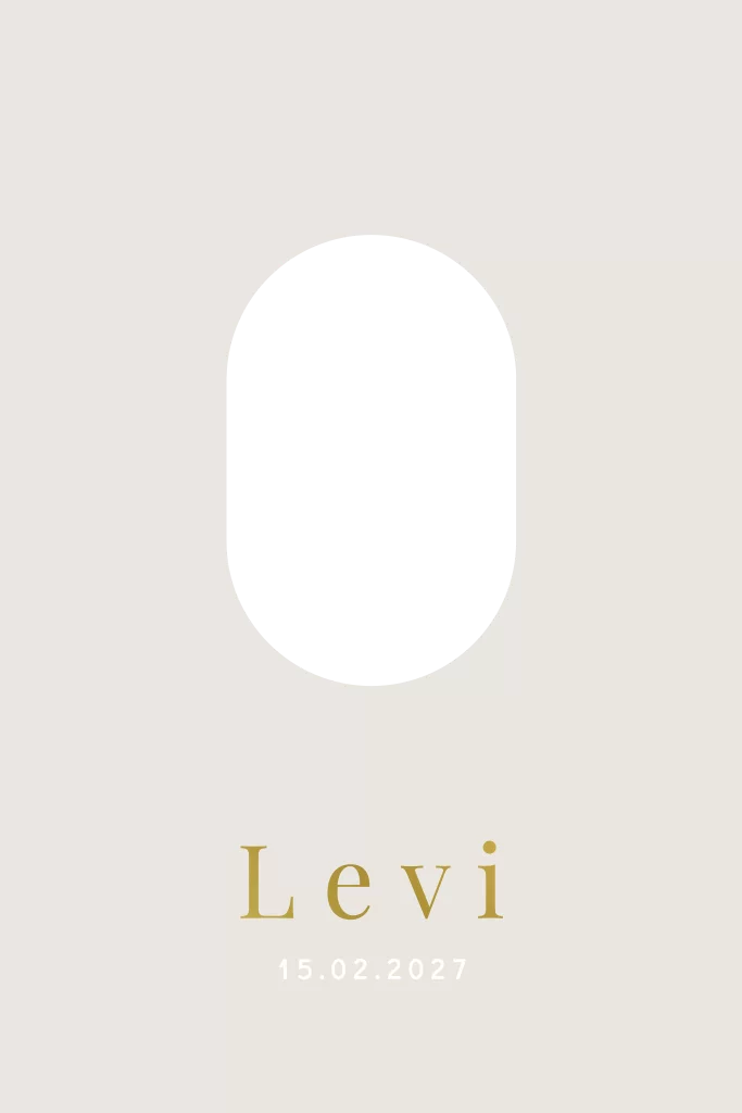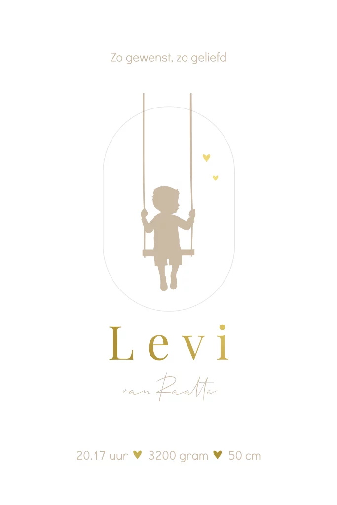 Een trendy geboortekaartje met een doorkijkje. Het kaartje heeft een staand formaat met daarin een ovaal doorkijkje. Aan de binnenkant van het kaartje zie je een silhouetje van een jongen op schommel. De naam is gedrukt in foliedruk.