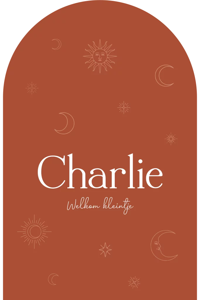 Dit is een uniek kaartje om de geboorte van jullie kindje aan te kondigen. Zowel leuk voor een jongen als een meisje! Op de donkerrode achtergrond staan lijntekeningen van zonnetjes, maantjes en sterretjes. De kaart heeft de vorm van een arch. Bestel snel een proefdruk om dit kaartje in het echt te zien!