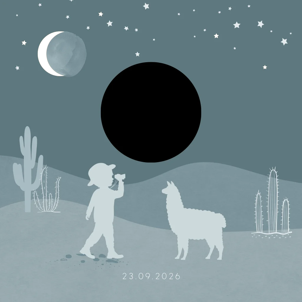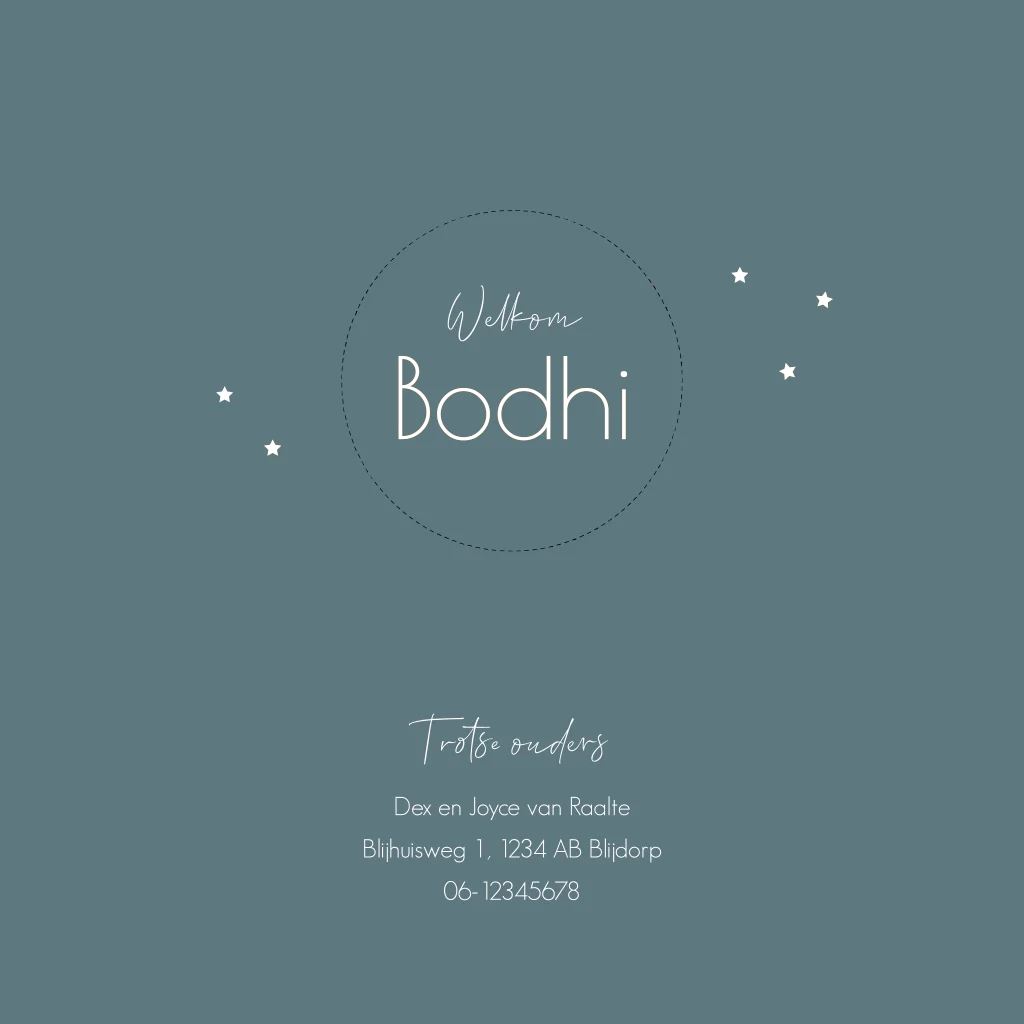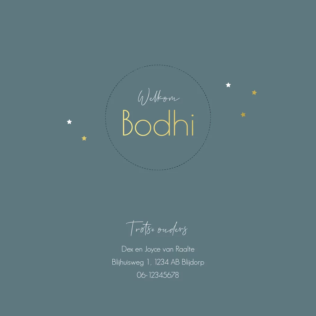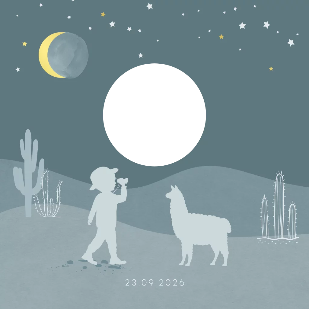 Een avontuurlijk geboortekaartje voor de geboorte van jullie zoontje. Het kaartje heeft een blauwe achtergrond met een prachtige sterrenhemel die in goudfolie wordt gedrukt. Op de voorkant is een stans van een rondje die een doorkijkje geeft naar de naam van jullie kleintje. De silhouetjes zijn van een jongetje en een lama op avontuur in de woestijn.