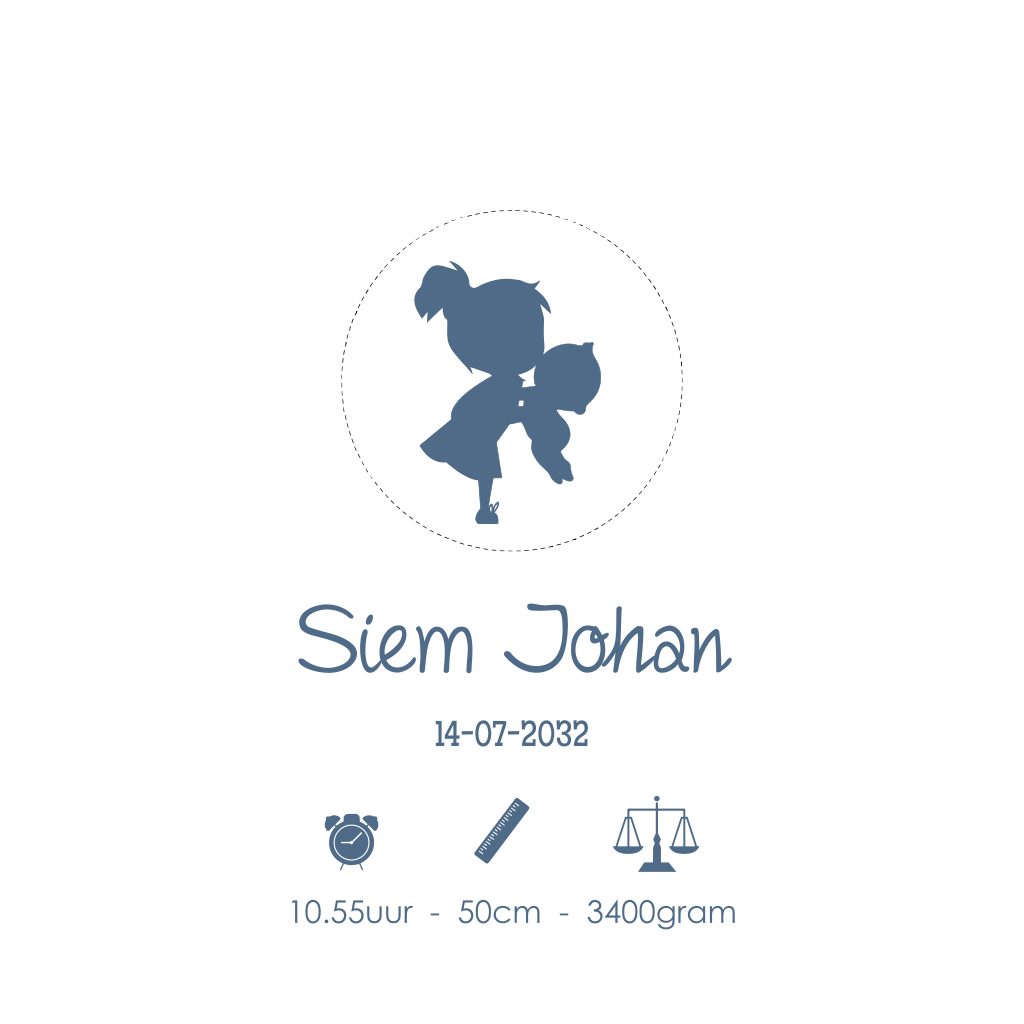 Een lief geboortekaartje voor de geboorte van jullie tweede kindje, een jongetje. Het kaartje heeft een stansvorm dat een doorkijkje is naar een lief silhouetje van grote zus die haar kleine broertje een kus geeft. De achtergrond heeft een blauwe kleur maar kan in de editor aangepast worden naar eigen smaak. Daarnaast vind je in onze editor verschillende silhouetjes die je kan toepassen.