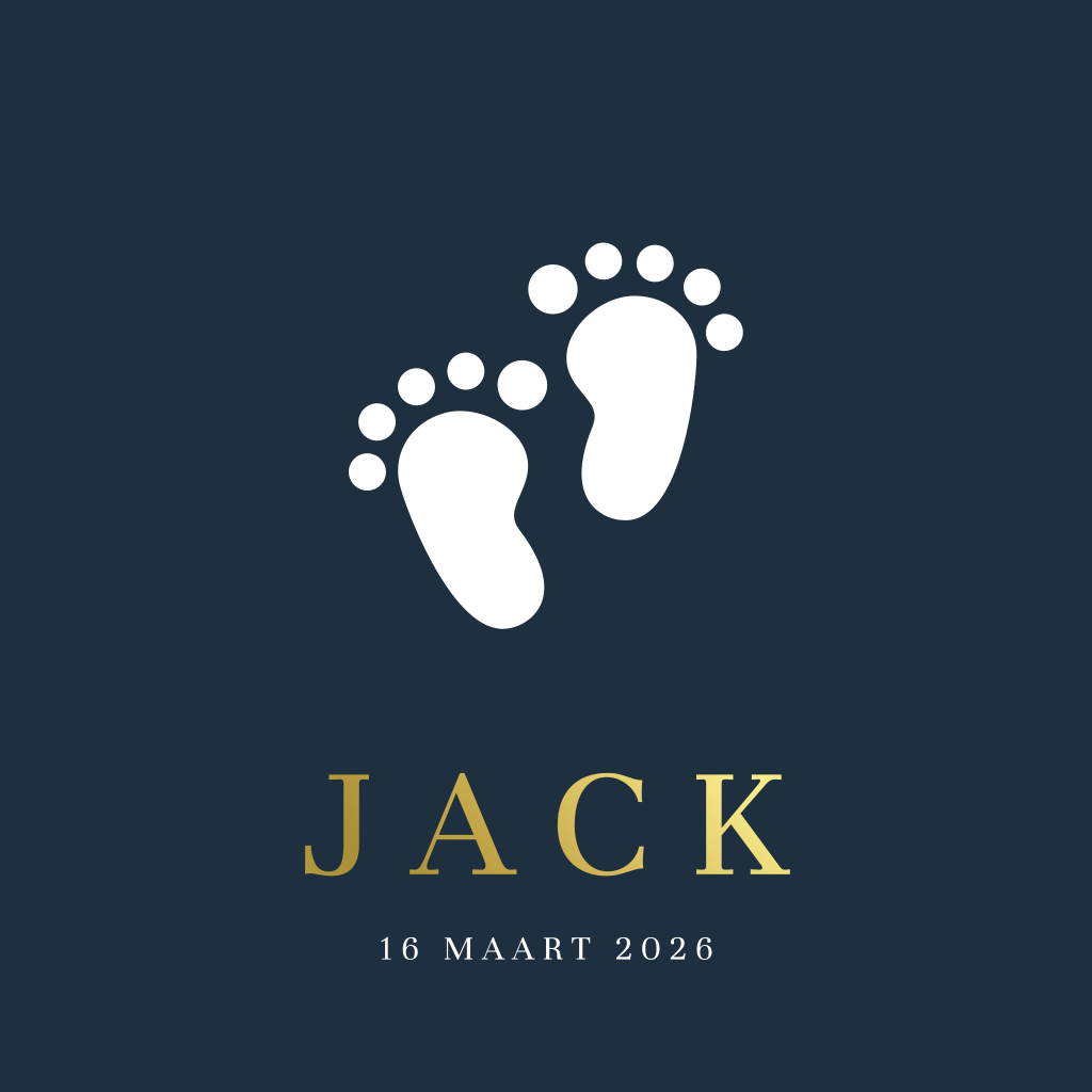 Dit is een luxe geboortekaart voor jullie zoontje. Het kaartje heeft een donkerblauwe achtergrond met uitsnede van babyvoetjes. De naam van jullie kleintje wordt gedrukt in goudfolie en maakt dit kaartje helemaal compleet. Pas het kaartje naar wens aan in onze online editor en bestel snel een proefdruk om dit kaartje in het echt te zien!