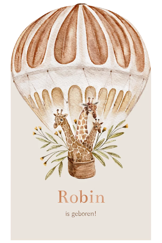 Een uniek geboortekaartje in de vorm van een luchtballon. In de luchtballon zitten papa, mama en baby giraffe. Het kaartje heeft een ontwerp van watercolour met de naam in hoogglans gedrukt. In onze online editor kan je het kaartje naar wens aanpassen.