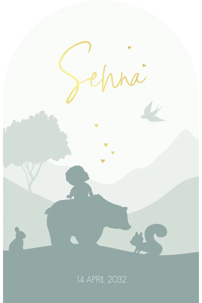 Een vrolijk geboortekaartje voor jullie zoontje. Het kaartje heeft leuke silhouetjes van een kindje omringd door verschillende bosdieren. Het kaartje heeft een unieke arch vorm en goudfolie letters.