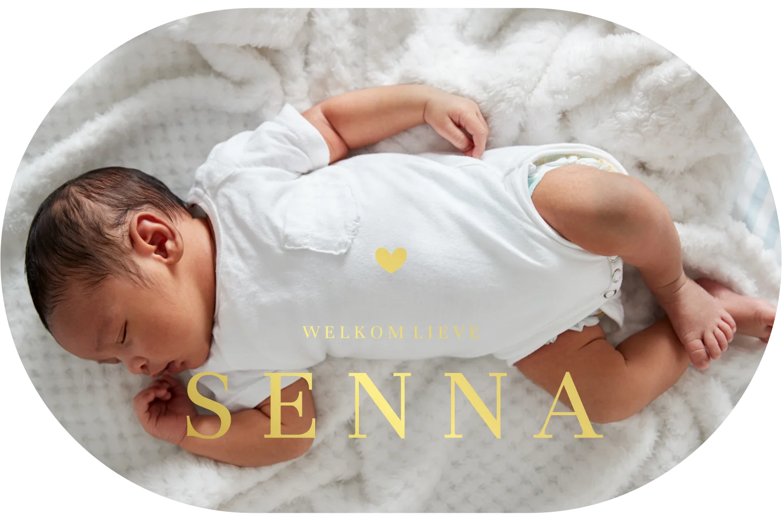 Trendy, romantisch geboortekaartje voor een jongen in een ovaal ontwerp met spetters en de naam in goudfolie.