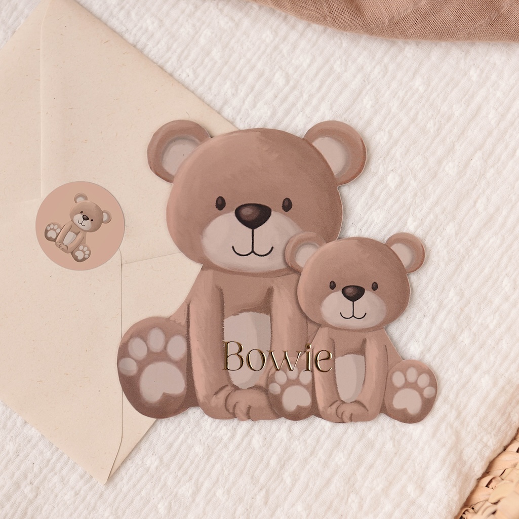 Kondig de geboorte van jouw kindje aan met dit vrolijke geboortekaartje. Het kaartje kondigt de geboorte van jullie tweede kindje aan. Dit kaartje heeft de vorm van twee beertjes. De naam wordt gedrukt in goudfolie. Pas het kaartje naar wens aan in onze editor.