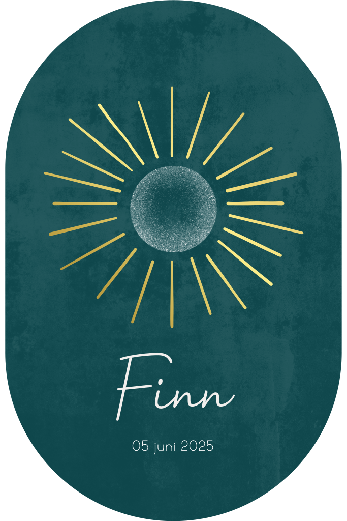 Een stoer en stijlvol geboortekaartje voor jullie zoon. Dit is een origineel ovaal geboortekaartje met een prachtige goudfolie zon. De achtergrond van dit kaartje heeft een groene velvet-look. Het kaartje kan je volledig personaliseren in onze online editor.