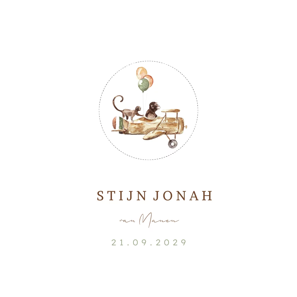 Kondig de geboorte van jullie zoontje aan met dit stijlvolle kaartje. De combinatie van de donkergroene achtergrond met goudfolie opdruk is prachtig. De uitgesneden cirkel geeft een doorkijkje naar twee aapjes in een vliegtuigje aan de binnenkant van de kaart. De ballonnen maken dit kaartje extra feestelijk.