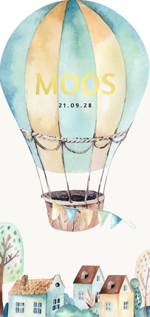 Een origineel geboortekaartje in arch vorm. Op het kaartje zie je een watercolour luchtballon met goudfolie details. Onder de luchtballon zie je schattige huisjes. Pas het kaartje naar wens aan in onze online editor.