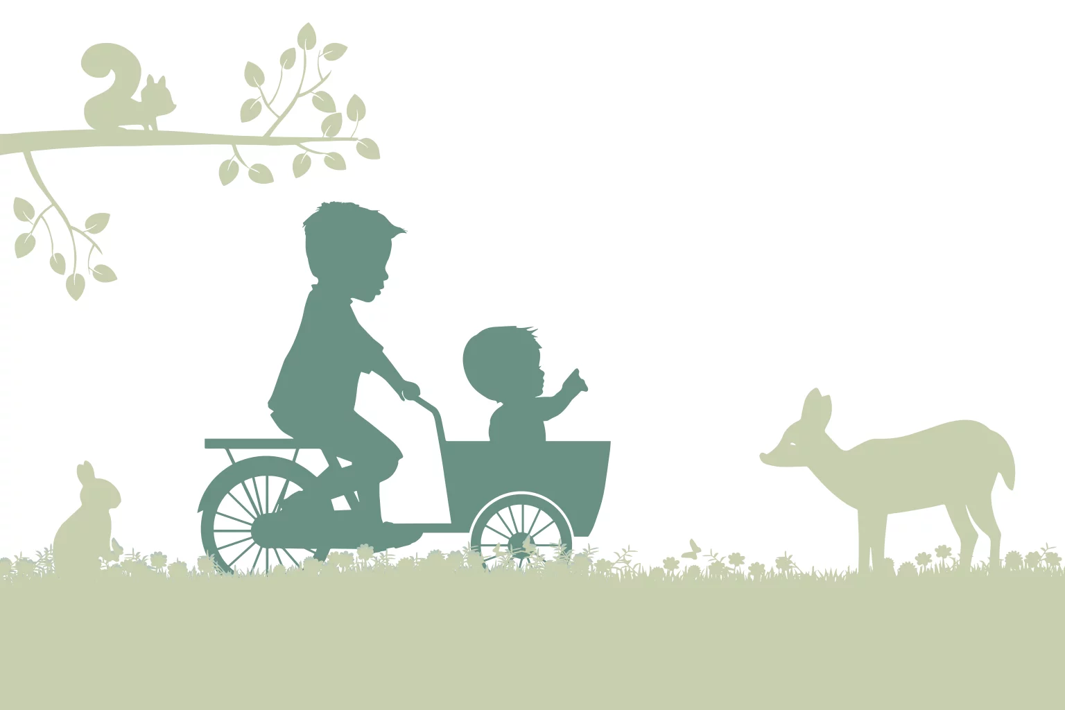 Een vrolijk groen geboortekaartje met doorkijkje. Op het kaartje zie je verschillende bosdieren en grote broer die zijn kleine broertje rond rijdt in de bakfiets. Op het kaartje zie je verschillende bosdieren als een eekhoorntje, konijn en hertje. Pas het kaartje naar wens aan in onze online editor.