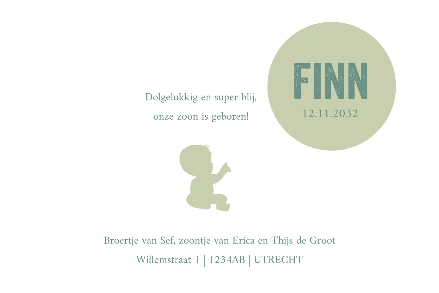 Groen geboortekaartje jongen met doorkijkje en bakfiets met broer