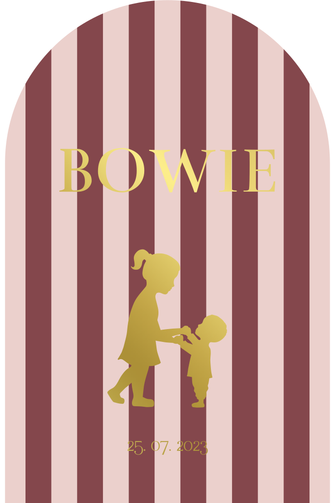 Een origineel en hip geboortekaartje voor jouw kindje. Dit kaartje heeft een arch vorm met verschillende goudfolie details. De achtergrond heeft een strepen patroon in de kleuren bordeaux rood en licht roze. Pas het kaartje naar wens aan in onze online editor.