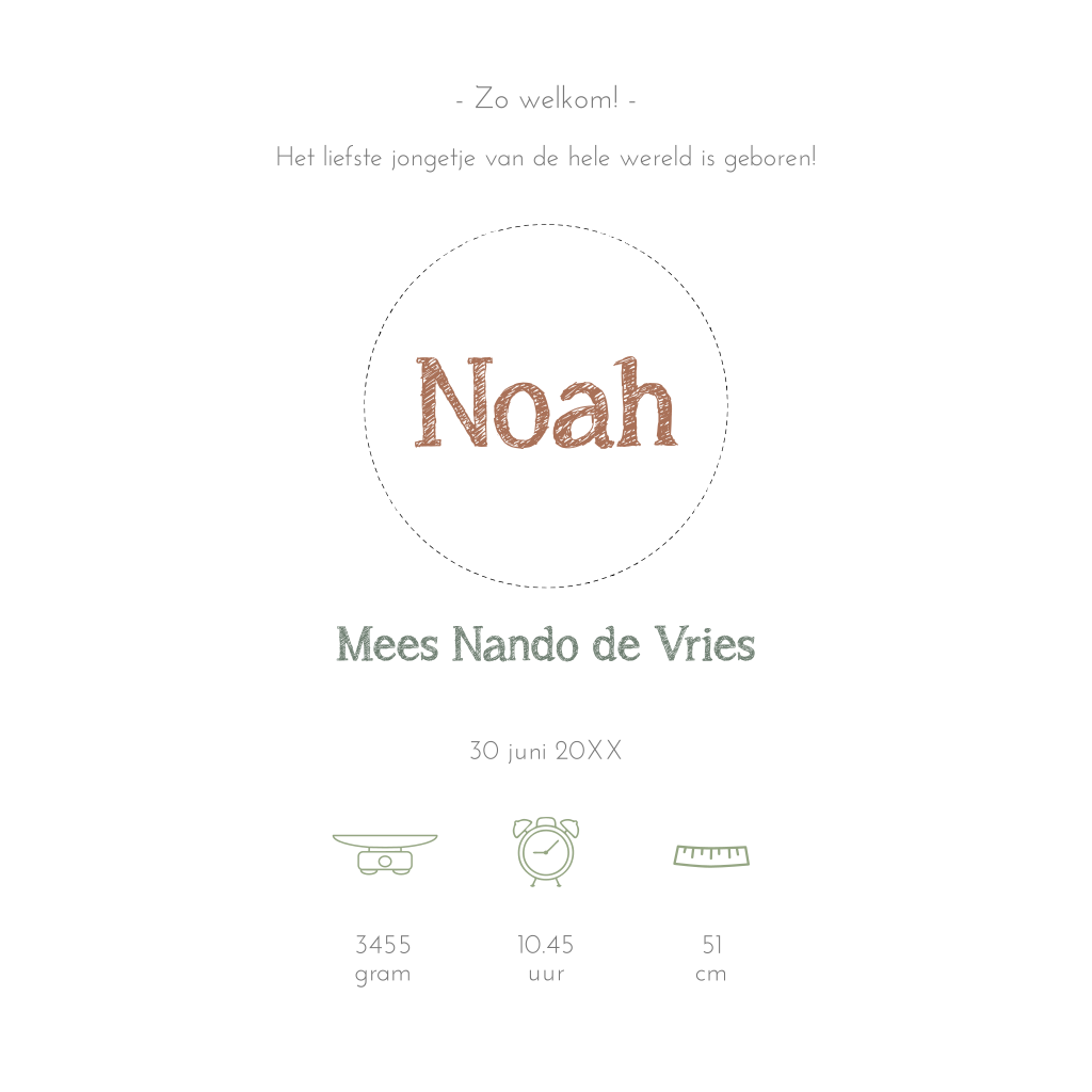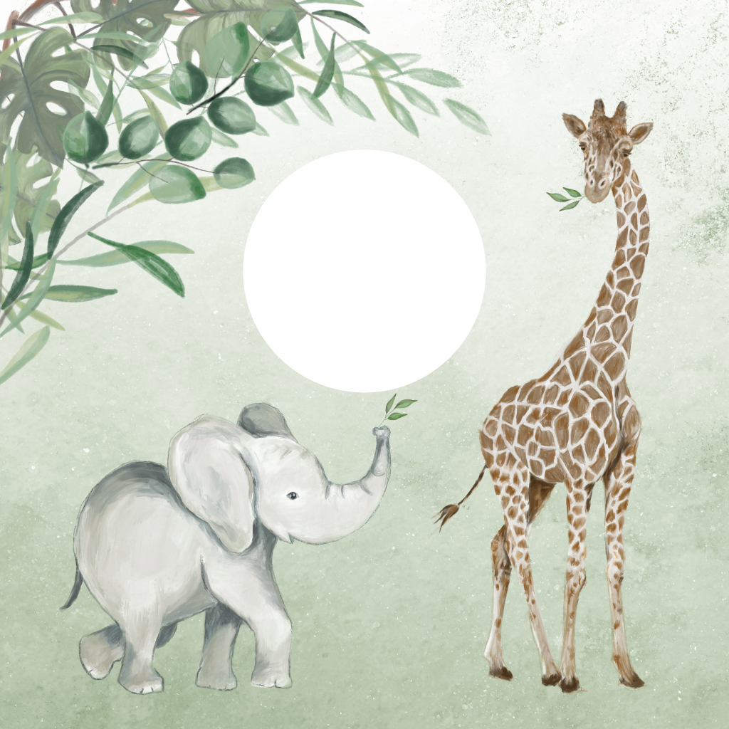 Jungel geboortekaartje met een uitgesneden rondje. In dit rondje zie je een doorkijkje naar de naam van jullie kindje. Op het kaartje zie je verder mooie illustraties van een olifant en giraffe. Het kaartj heeft een prachtig groene kleur.