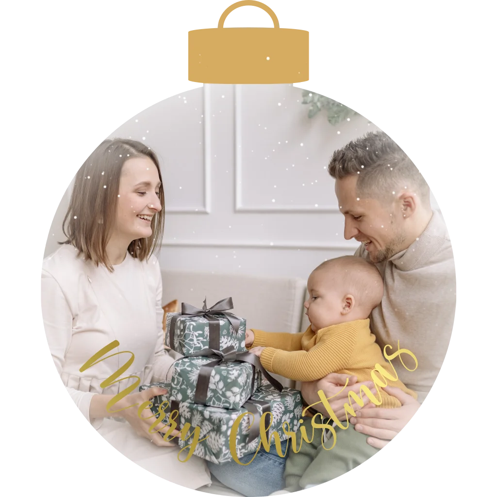 Kerstkaart in vorm van kerstbal met foto en goudfolie