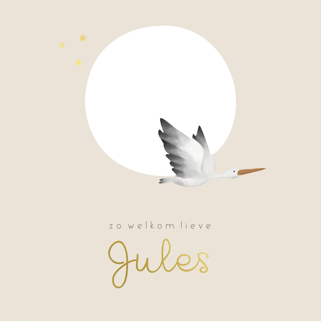 Een lief geboortekaartje voor jou kindje. Op het geboortekaartje zie je een doorkijkje naar een prachtige illustratie van een vliegende ooievaar, maan en sterretjes. De naam en sterren zijn gedrukt in goudfolie. Pas dit kaartje naar wens aan in onze online editor.