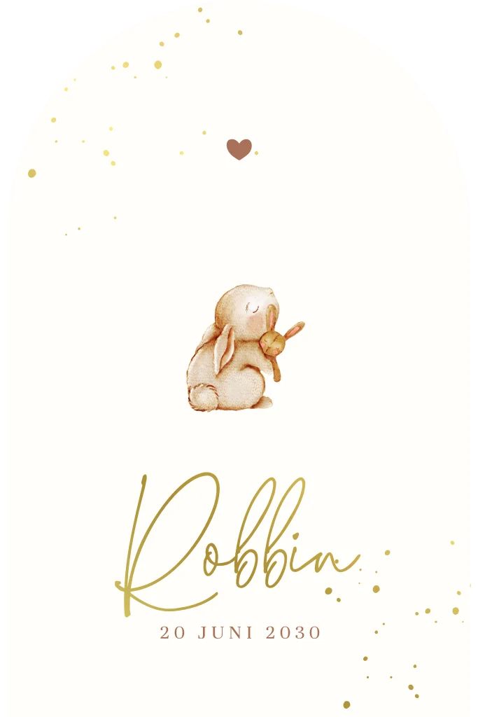 Dit is een stijlvol geboortekaartje in boogvorm. een minimalistische en luxe uitstraling. Op de voorkant staat een schattig konijntje dat een klein knuffelkonijntje vasthoudt, wat het ontwerp een tedere en liefdevolle sfeer geeft. De zachte illustratie wordt prachtig aangevuld met elegante details, waaronder een lief hartje en subtiele gouden glitters.