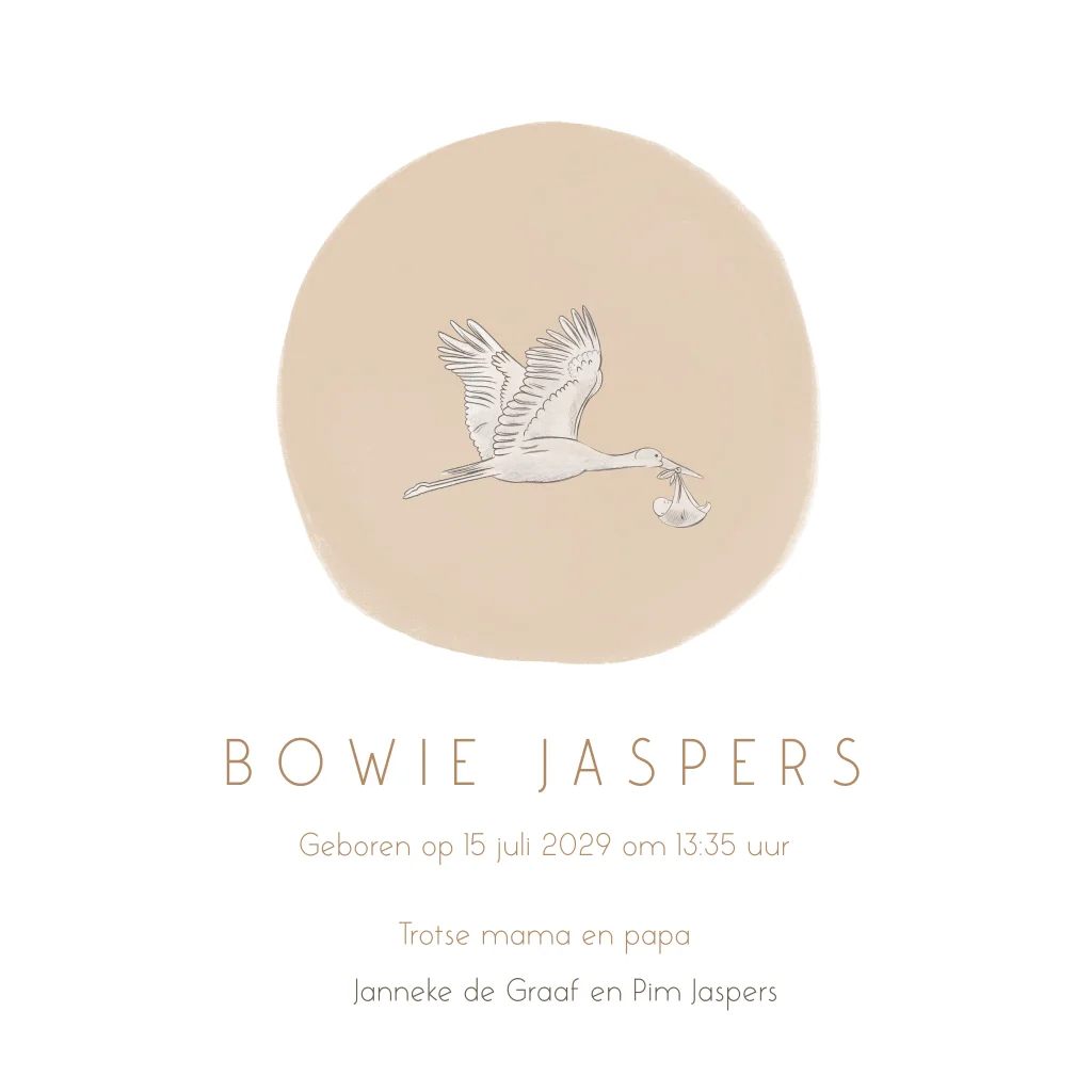 Wat een schattig geboortekaartje voor jouw kindje. Het kaartje heeft een beige basis met daarop wolkjes. Via de wolkjes kan je doorkijken naar een vliegende ooievaar. Pas het ontwerp naar wens aan.