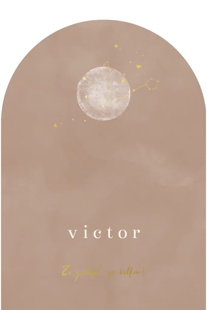 Dit is een prachtig geboortekaartje voor jullie zoon. Het kaartje heeft een bruine achtergrond. Op het kaartje zijn een maan, sterren en sterrenbeeld te zien. Het kaartje kan helemaal naar wens aangepast worden in onze online editor.