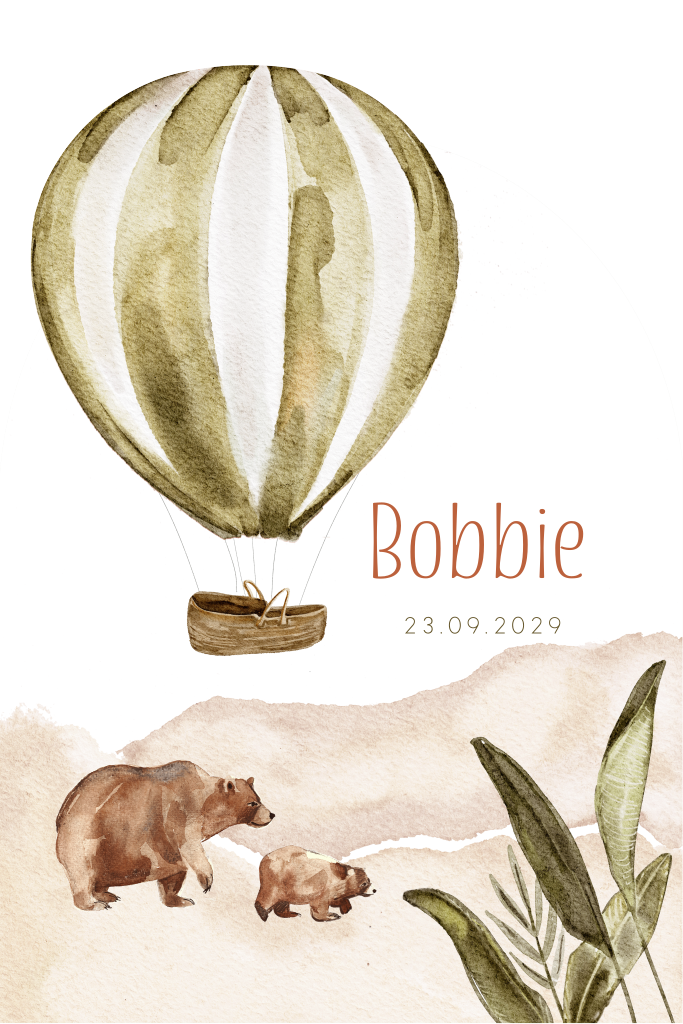 Een origineel geboortekaartje met een watercolour design. Het design heeft een mama beer en een baby beer. Daarnaast heeft het designs een mooie groene luchtballon met een mandje. Het kaartje heeft een orignele vorm. In onze online editor kan je het kaartje personaliseren naar wens. Bestel vervolgens een proefdruk om het kaartje in het echt te bekijken.