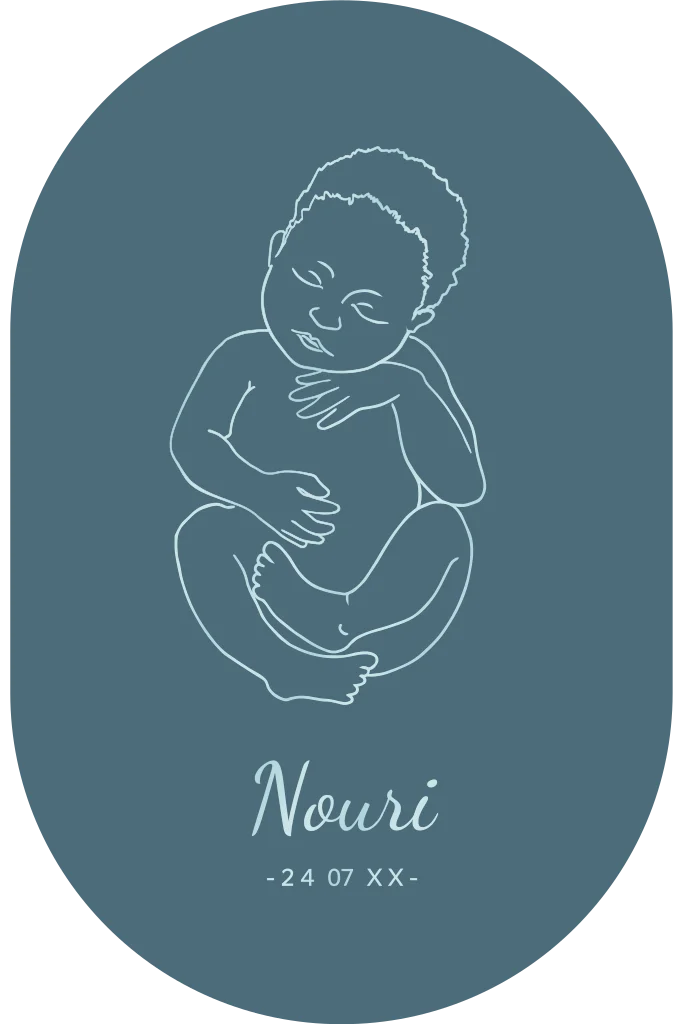 Een tof en een origineel geboortekaartje in de vorm van een ovaal. Het kaartje heeft een prachtige blauwe achtergrond met daarop een lijntekening van de baby. De lijntekening en naam wordt gedrukt in lichtblauwe hoogglans.