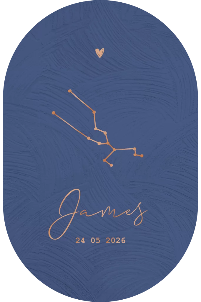 Wat een stoer geboortekaartje voor een zoontje. Het kaartje heeft een blauwe structuur achtergrond. Op de voorgrond zie je het sterrenbeeld, de naam en geboortedatum gedrukt in hoogglans. Het kaartje is volledig te personaliseren in onze online editor.