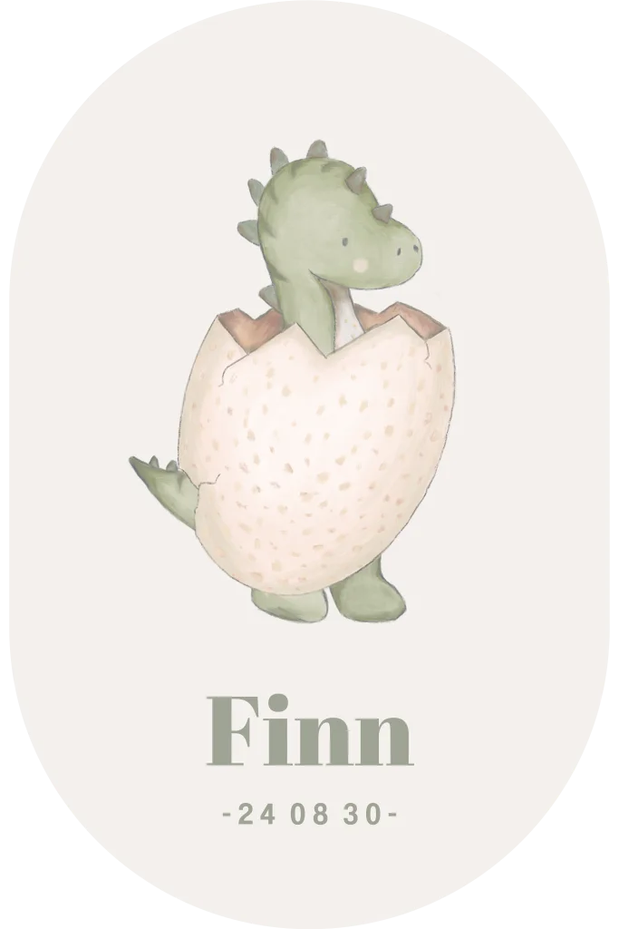Een vrolijk en origineel geboortekaartje voor jouw kindje. Het kaartje heeft een ovale vorm met lichtgroene achtergrond. Op de voorgrond zie je een vrolijke dino die uit een ei komt. Pas het ontwerp naar wens aan in onze online editor.