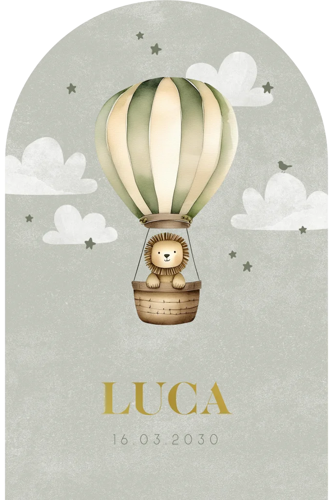 Een arch vorm geboortekaartje met groene achtergrond. Het kaartje heeft een lieve illustratie van een luchtballon met leeuwtje. Daarnaast zie je wolkjes en sterretjes. Pas het ontwerp naar wens aan in onze online editor.Dit product maakt onderdeel uit van deze set.
