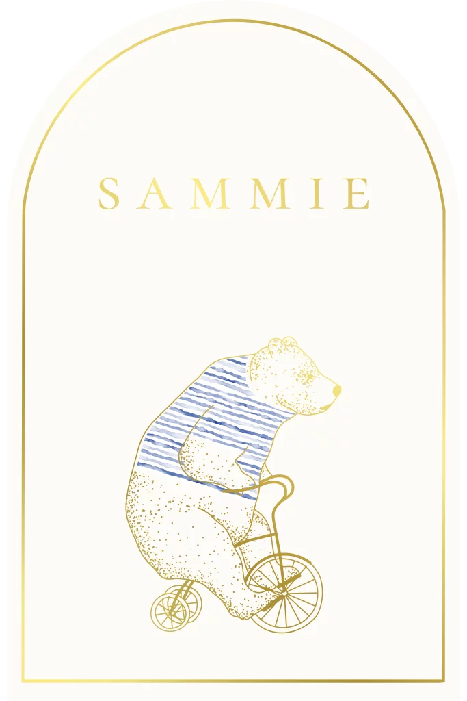 Een origineel geboortekaartje voor jullie kindje. Het kaartje heeft een boog vorm met goudfolie details. Op het kaartje zie een illustratie van een beer op de fiets. Pas het ontwerp naar wens zelf aan.