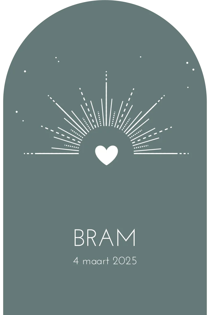 Een origineel geboortekaartje in de vorm van een arch. Op het kaartje zie je mooie zonnestralen met daarin een hart. Het ontwerp heeft een strak minimalistisch lettertype. Dit geboortekaartje voor jou zoon is volledig naar wens aan te passen in onze online editor.