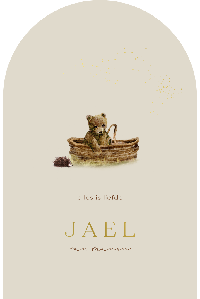 Kondig de geboorte van jullie kleintje aan met dit unieke kaartje! Het kaartje heeft de vorm van een arch. Centraal op het kaartje is een beertje in een mand met daarnaast een egel getekend. De goudfolie naam en spetters maken dit kaartje extra feestelijk. Het kaartje kan naar wens aangepast worden in onze online editor.