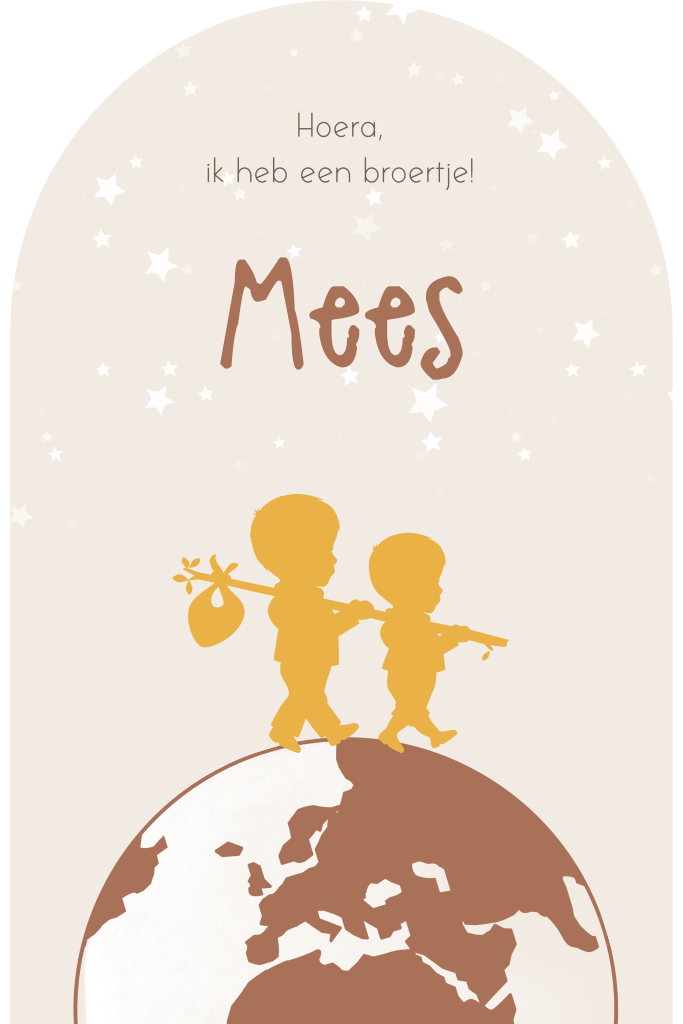 Kondig de geboorte van jullie zoon en broertje aan met dit kaartje. Het kaartje heeft de vorm van een arch. Twee silhouetjes van een grote broer met zijn kleine broertje lopen op de wereldbol. Pas het kaartje naar wens aan in onze online editor en bestel snel een proefdruk om dit kaartje in het echt te zien!