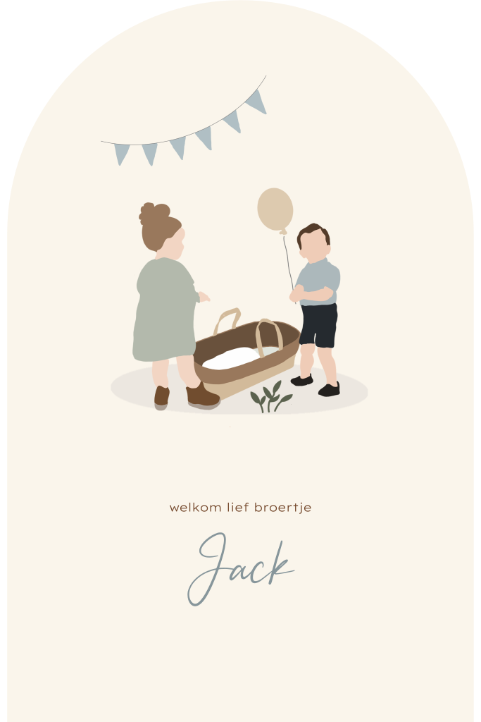 Kondig de geboorte van jullie zoontje aan met dit unieke kaartje! Het kaartje heeft de vorm van een arch. Op het kaartje staan de illustraties van een grote zus en grote broer bij een Mozes mandje. De slingers en de ballon maken dit kaartje extra feestelijk. Pas het kaartje aan in onze online editor en bestel snel een proefdruk om dit kaartje in het echt te zien!