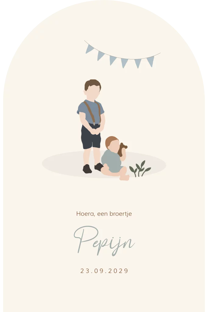 Kondig de geboorte van jullie zoontje en broertje aan met dit bijzondere kaartje! Het kaartje heeft de vorm van een arch. Op het kaartje is een grote broer met zijn kleine pasgeboren broertje te zien. De slingers maken dit kaartje extra feestelijk. Pas het kaartje naar wens aan in onze online editor en bestel snel een proefdruk om dit kaartje in het echt te zien!