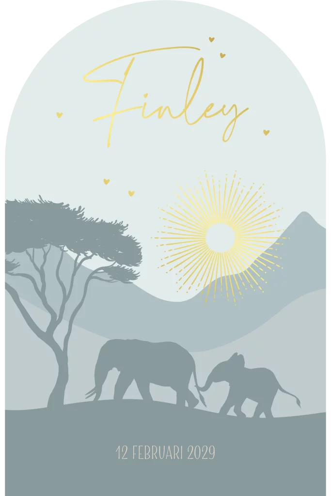Uniek geboortekaartje met landschap, olifanten en goudfolie