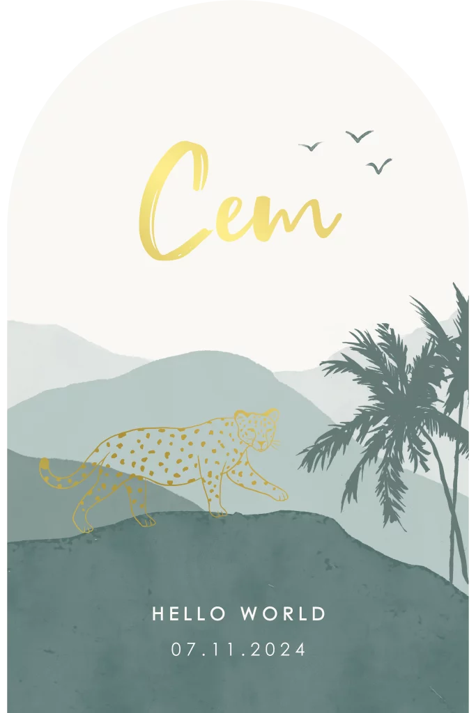 Dit is een uniek geboortekaartje voor jullie zoon. Het kaartje heeft de vorm van een arch. Midden in een abstract landschap staat de lijntekening van een panter. De goudfolie details maken dit kaartje extra feestelijk. Pas het kaartje naar wens aan in onze online editor en bestel snel een proefdruk om dit kaartje in het echt te zien!