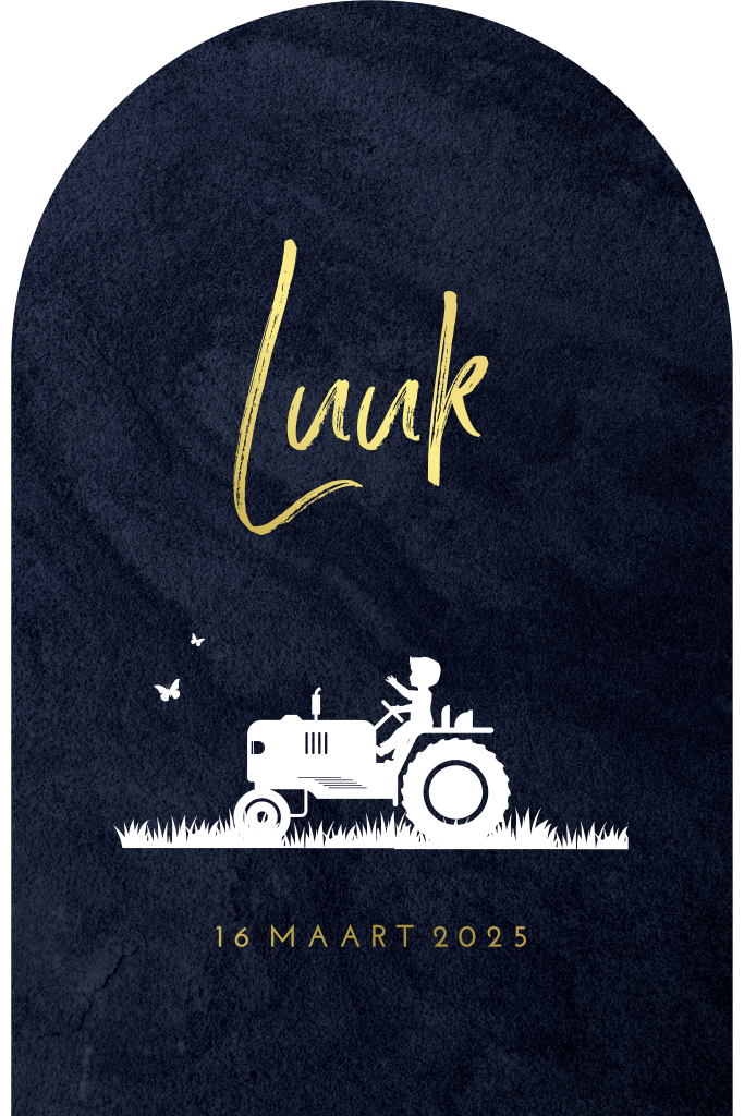 Kondig de geboorte van jullie zoon aan met dit mooie kaartje. Het kaartje heeft de vorm van een arch met donkerblauwe velvet-look achtergrond. Op het kaartje staat de illustratie van een jongen op een tractor. De goudfolie typografie maakt dit kaartje helemaal af. Pas het kaartje naar wens aan in onze online editor en bestel snel een proefdruk om dit kaartje in het echt te zien!