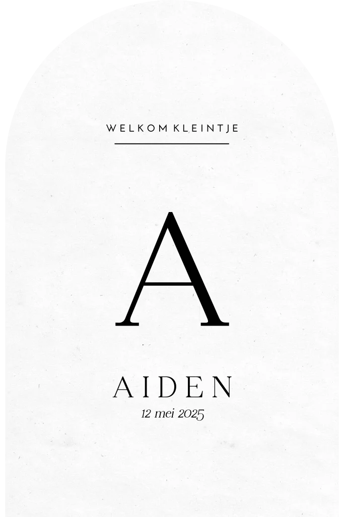 Dit is een minimalistisch én origineel geboortekaartje voor jullie zoontje. De initiaal trekt alle aandacht en valt extra goed op tegen de lichte achtergrond. Het kaartje heeft de vorm van een arch en is naar wens aan te passen in onze online editor. Bestel een proefdruk om dit kaartje in het echt te zien!