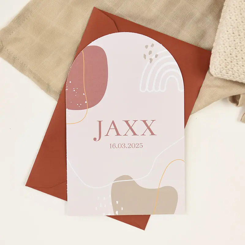 Kondig de geboorte van jullie kleine jongen aan met dit originele kaartje! Op het kaartje zijn organische vormen te zien in rood- en groentinten. De lijntekening van een regenboog geeft een extra wauw-factor aan dit kaartje. Het kaartje heeft de vorm van een arch. Bestel snel een proefdruk om dit kaartje in het echt te zien!