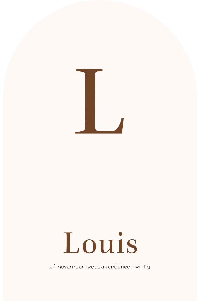 Kondig de geboorte van jullie kleintje aan met dit minimalistische kaartje. Het kaartje heeft de vorm van een arch met centraal op het kaartje een groot initiaal. De bruine opdruk komt goed naar voren tegen de lichte achtergrond. Deze kaart is naar wens aan te passen in onze online editor.