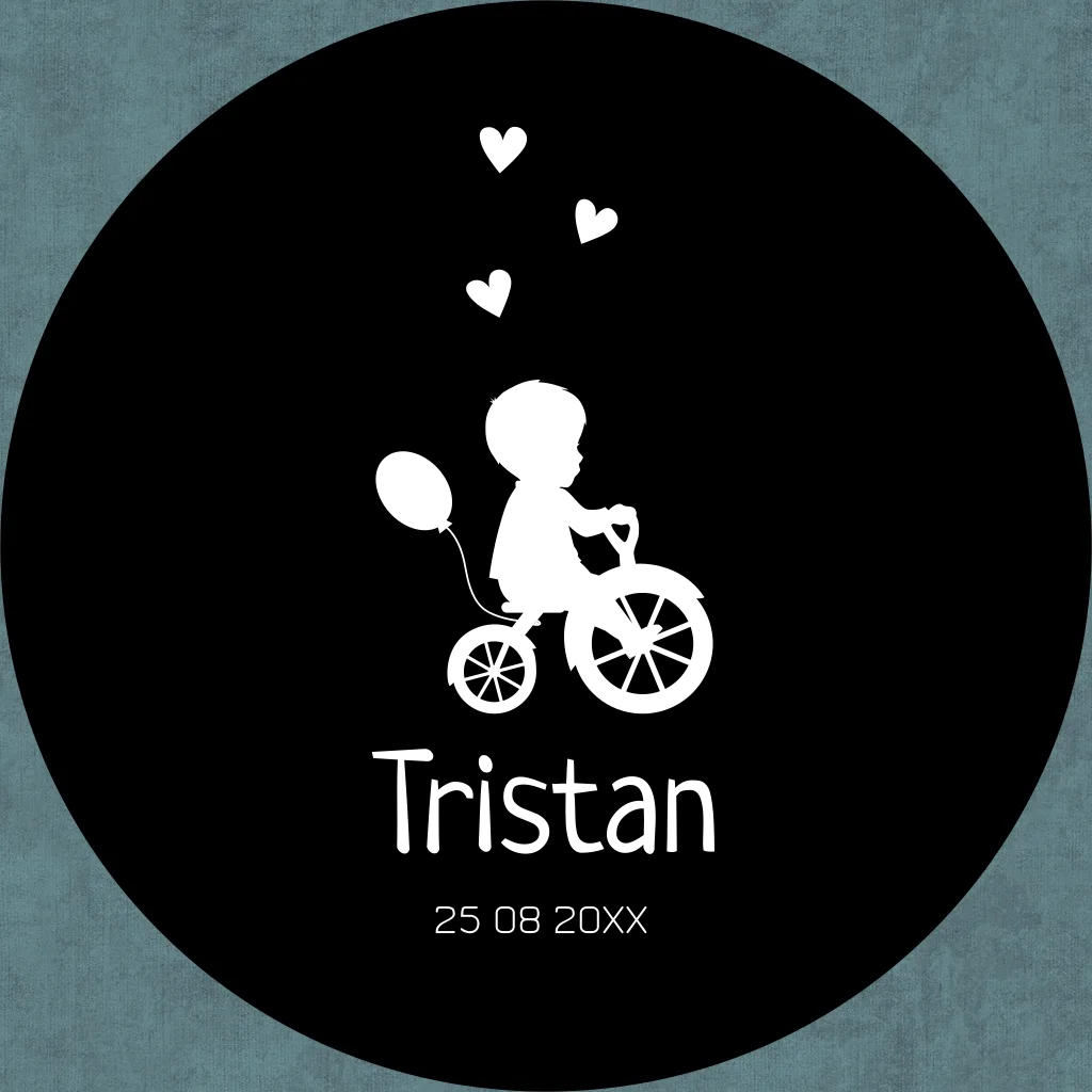 Dit is een uniek kaartje voor de geboorte van jullie zoontje. Het kaartje heeft de vorm van een cirkel. Op de blauwe velvet-look achtergrond staat het silhouet van een jongen op een driewieler. De goudfolie opdruk geeft dit kaartje een luxe uitstraling. Pas het kaartje naar wens aan in onze online editor en bestel snel een proefdruk om dit kaartje in het echt te zien!
