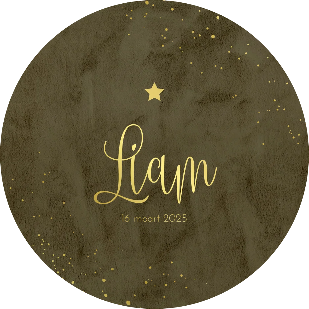 Kondig de geboorte van jullie zoontje aan met deze originele kaart! De groene velvet-look achtergrond zorgt voor een stoere uitstraling. De goudfolie typografie, ster en spetters komen prachtig naar voren. Het kaartje heeft de vorm van een cirkel. Bestel snel een proefdruk om dit kaartje in het echt te bewonderen!