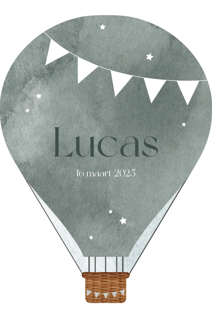 Kondig de geboorte van jullie zoon aan met dit bijzondere kaartje! Het kaartje heeft de vorm van een luchtballon. De achtergrond heeft een grijze velvet-look waartegen de witte slingers goed opvallen. Pas het kaartje naar wens aan in onze online editor en bestel snel een proefdruk om dit kaartje in het echt te zien!