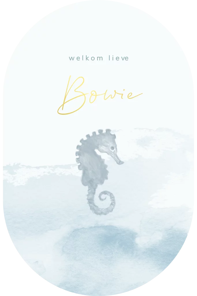 Kondig de geboorte van je zoon of dochter aan met dit unieke kaartje. Het kaartje heeft de vorm van een ovaal met blauwe watercolour achtergrond en de illustratie van een zeepaardje. Het kaartje kan helemaal naar wens aangepast worden in onze online editor.