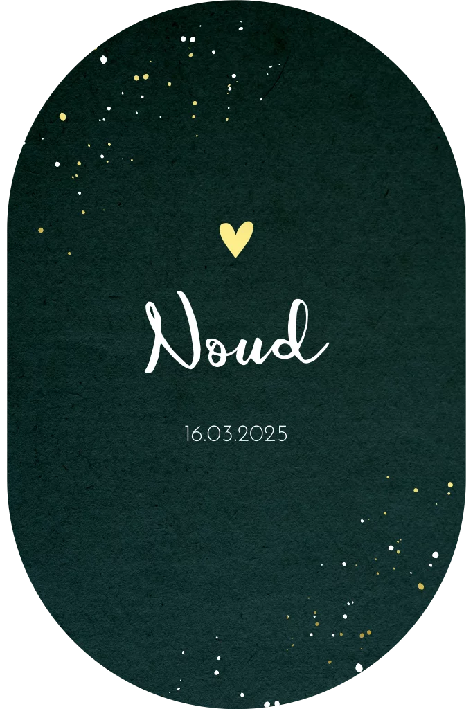 Dit is een prachtig kaartje voor de geboorte van jullie zoon. Het kaartje heeft de vorm van een ovaal met groene achtergrond. Het hartje boven de naam wordt gedrukt in goudfolie. De spetters in wit en goudfolie maken dit kaartje helemaal feestelijk! Pas het kaartje naar wens aan in onze online editor en bestel snel een proefdruk om dit kaartje in het echt te zien!