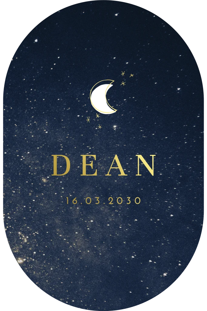 Bijzonder ovaal geboortekaartje met sterrenhemel en goudfolie