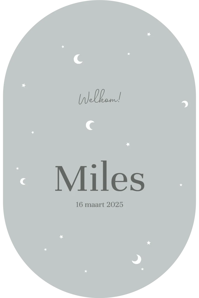 Dit is een uniek kaartje voor jullie pasgeboren zoontje. De witte sterretjes en maantjes komen goed naar voren tegen de lichtgrijze achtergrond. Het kaartje heeft de vorm van een ovaal. Pas het kaartje naar eigen wens aan in onze online editor en bestel snel een proefdruk om dit kaartje in het echt te zien!