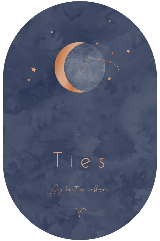 Kondig de geboorte van jullie zoontje aan met dit prachtige kaartje! Op het kaartje zijn een maan, sterren en sterrenbeeld te zien. Het sterrenbeeld is aan te passen naar het sterrenbeeld van jouw kindje. Neem hiervoor contact op met onze klantenservice.